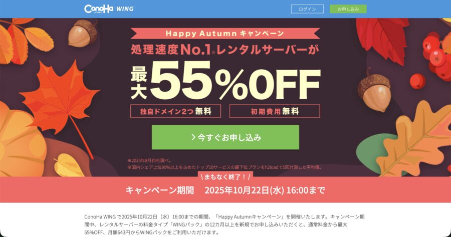ConoHa WINGでは、2025年10月22日(水) 16:00まで「Happy Autumnキャンペーン」を開催中です。