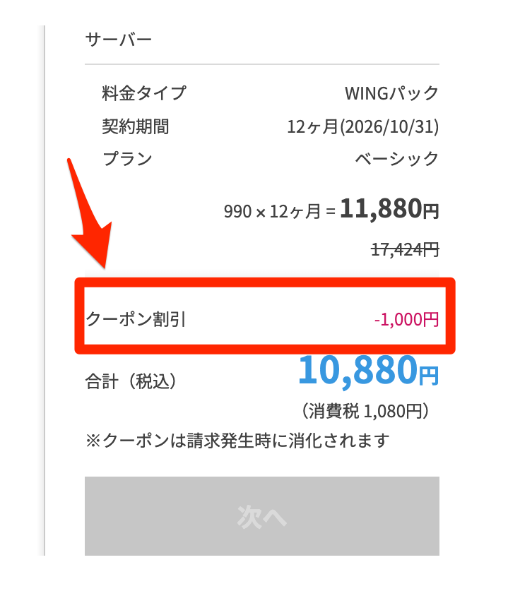 本記事からConoHa WINGに申し込むと「1,000円OFFのクーポン」がついてきます。